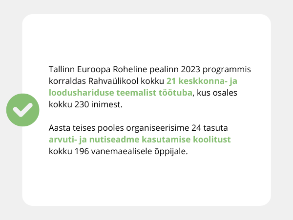 Tallinna Rahvaülikoolis korraldati aasta jooksul kokku pea 330 kursust, töötuba, huviringi või õpisündmust (284 erinevat õppekava), kus kokku osales üle 3100 inimese.
